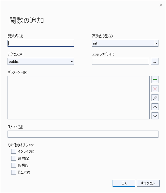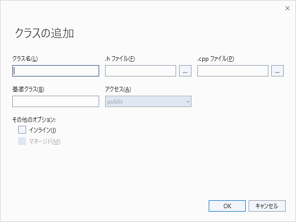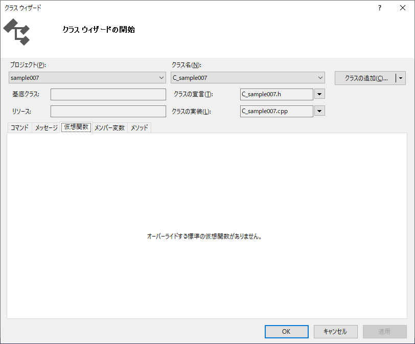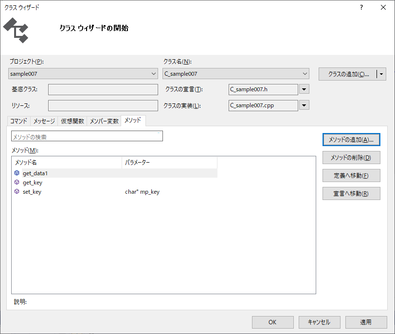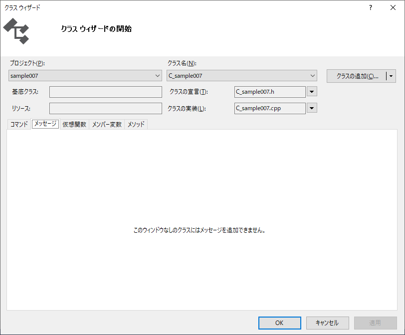 プロジェクト の クラスの追加 の下に 「クラス ウィザード」ってのがあるので起動してみる。