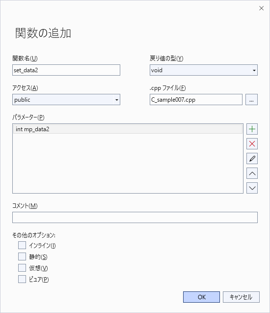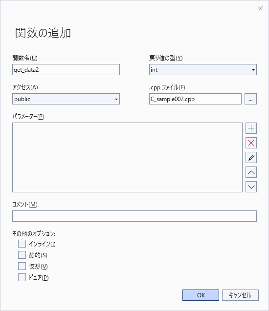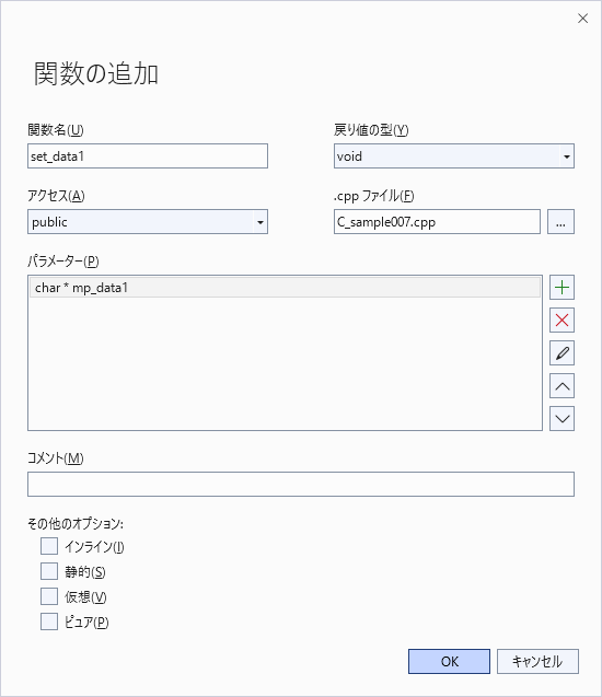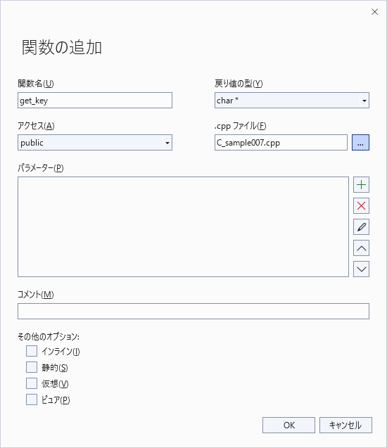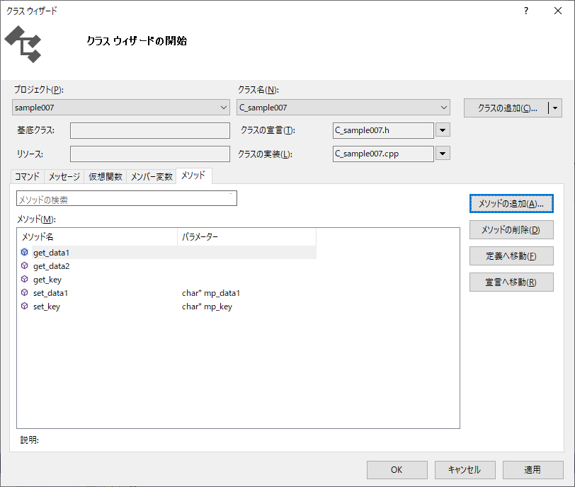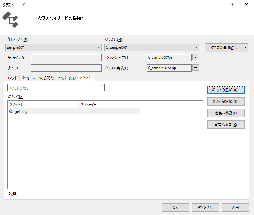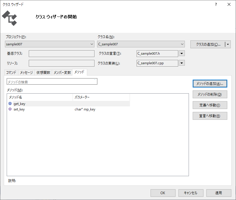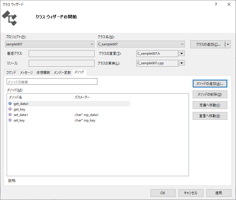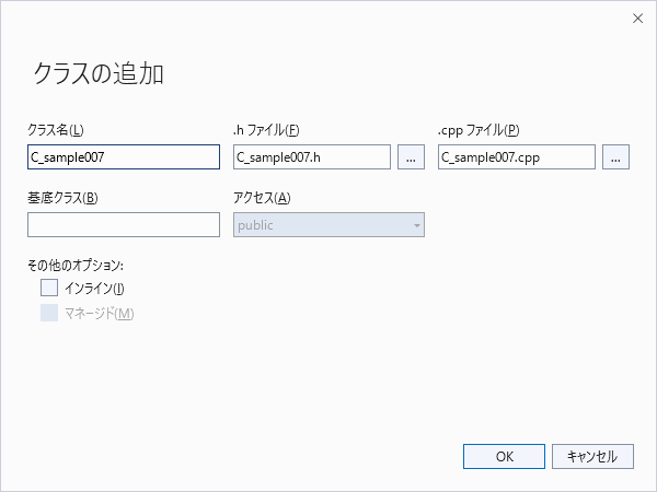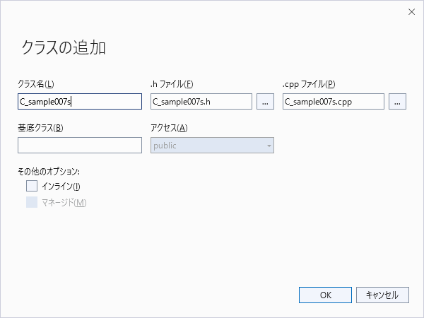 なんと、クラス名に C_sample007 と、入力すると .hファイル .cppファイル に勝手に入力されるじゃありませんか。