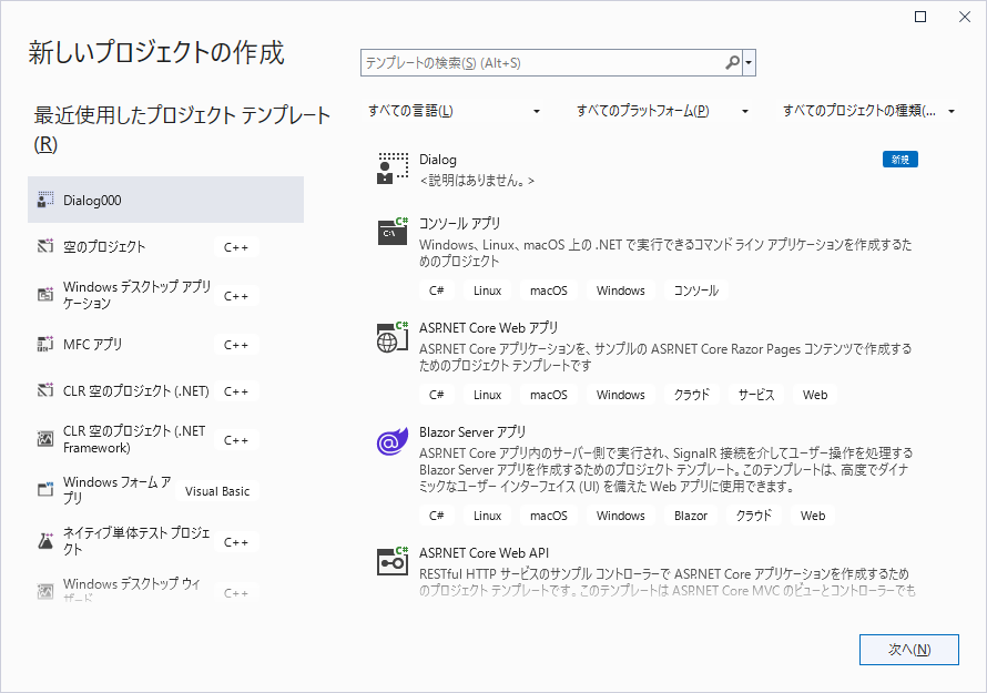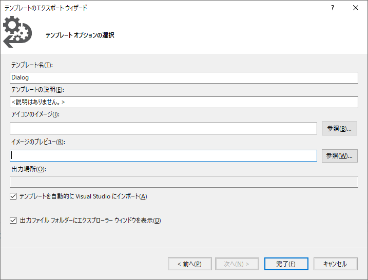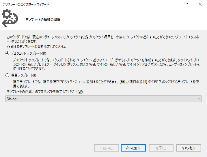 ちょっと寄り道 テンプレートが簡単に作れるようなので Dialogのテンプレートを作成 まず、Dialog000を読み込んで Dialog000からDialog変えておいて 「プロジェクト」「テンプレートのエクスポート」