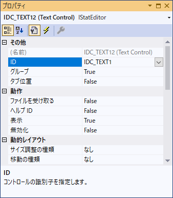 IDを、IDC_STATICからIDC_TEXT1に変えてみる。